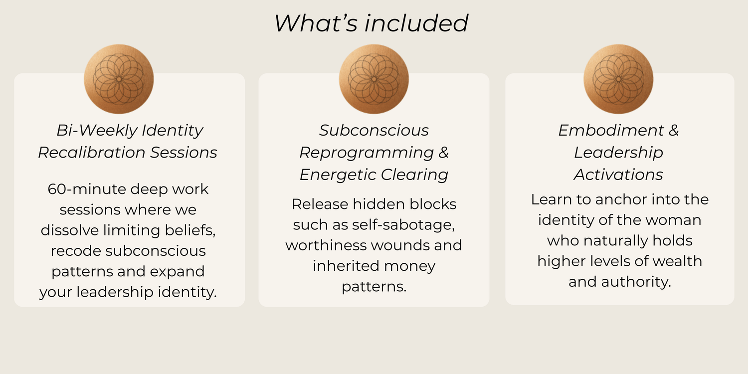A 6-month identity recalibration for the woman entrepreneur who is ready to stabilise her next level of leadership, authority and wealth.