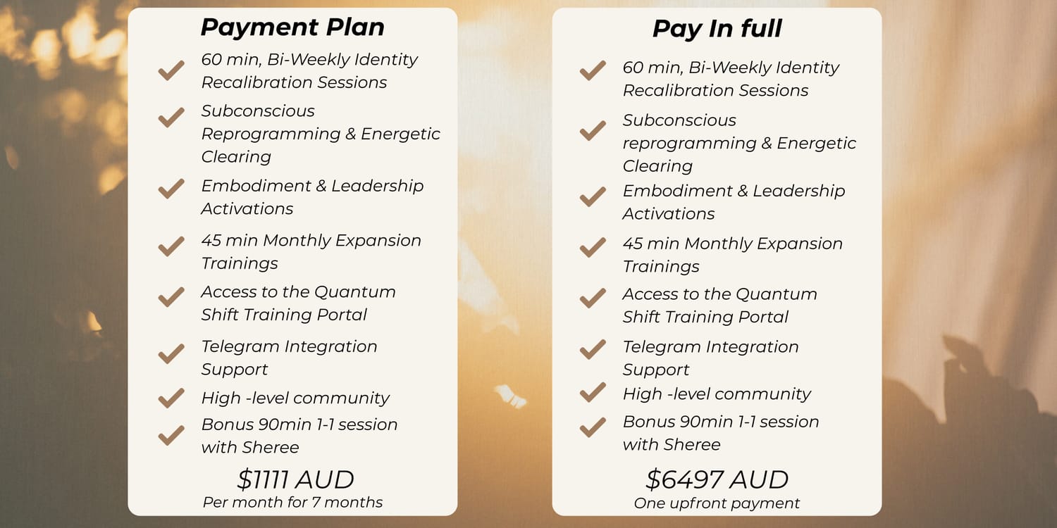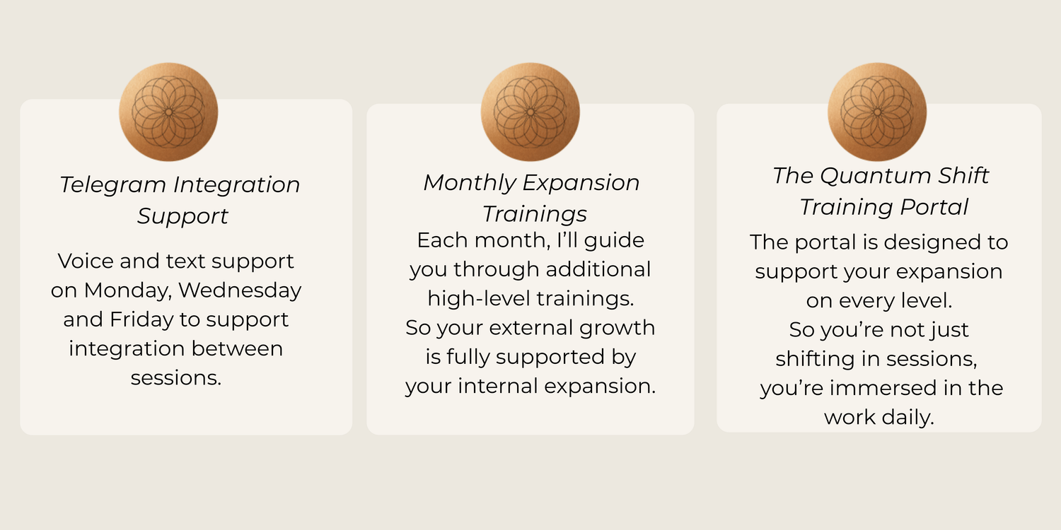 -Bi-weekly live Zoom calls (deep subconscious reprogramming of limiting beliefs and patterns + identity work)